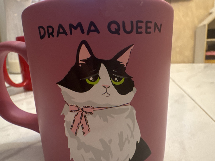 A close-up image focuses on a pink ceramic mug positioned in an indoor setting. The mug bears the black text "DRAMA QUEEN" in uppercase letters. Below the text is an illustration of a black and white cat with distinct bright green eyes, a pale pink nose, and dark outlines. The cat has prominent black markings on its face and ears, and a fluffy white chest. A pink ribbon tied in a bow is depicted around its neck. The mug's handle, also pink, is visible on the left side. In the blurred background to the left, a portion of a red mug is visible. Further back and to the right, a light-colored surface, possibly a table or countertop, extends horizontally, with indistinct, light-toned room elements, potentially furniture or shelving, and a beige wall visible behind it. The lighting suggests an artificial indoor light source. The specific geographic location of Plovdiv, Bulgaria, is not discernible from the visual information presented in the image.