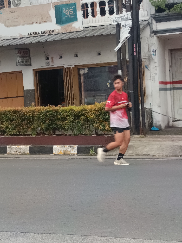 A young male jogs along an urban street in Cianjur, Indonesia, moving from right to left in the mid-ground