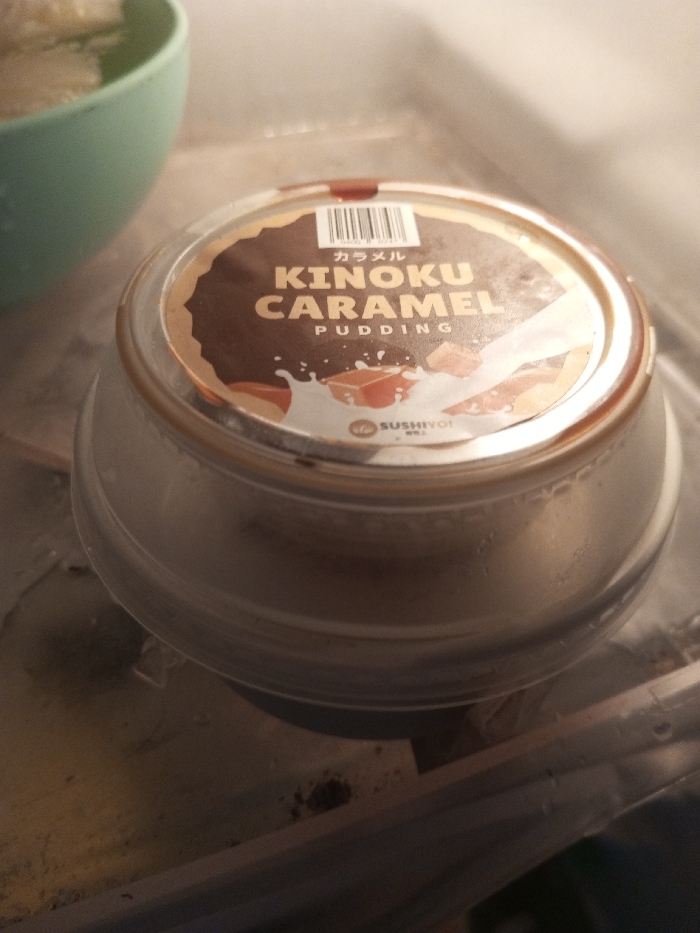 A glass container holds Kinoku caramel pudding with a brown and white label. The label states "KINOKU CARAMEL PUDDING" in bold text. There is a barcode above the lettering. Condensation covers the container's exterior. A green bowl partially visible in the background. The pudding sits on a dirty, possibly metallic, surface.