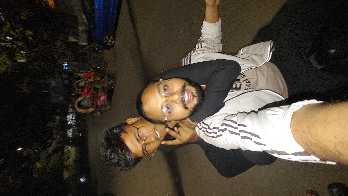 Two men, both wearing glasses, are posing closely for a selfie-style photograph outdoors at night