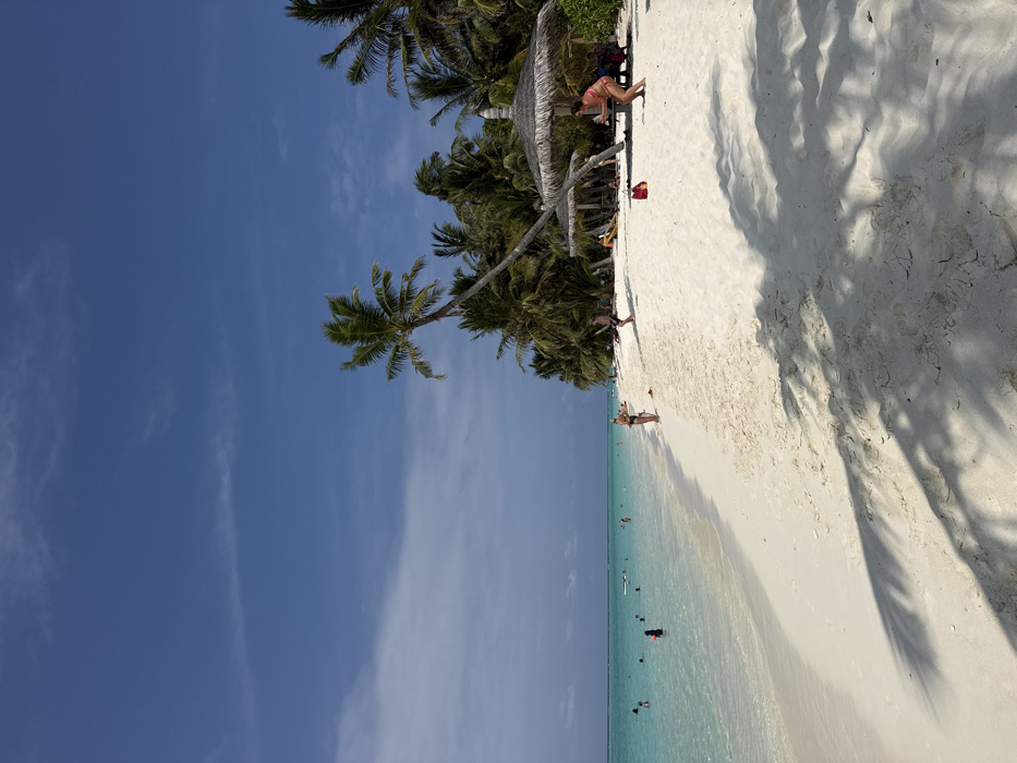 A tropical beach scene features white sand meeting turquoise water with scattered swimmers