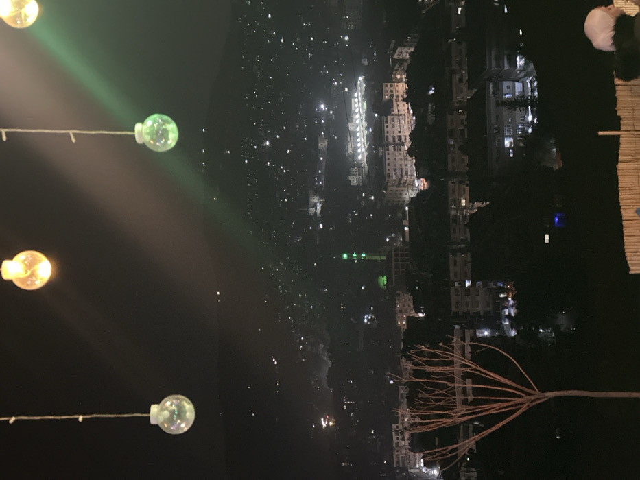 A nighttime cityscape is depicted with scattered lights across a dark expanse. Buildings line a section, illuminated against the night. String lights with spherical bulbs hang in the foreground, some glowing brightly. A bare tree branch angles into the scene from the right. The overall composition is dark with points of light, creating a sense of depth.