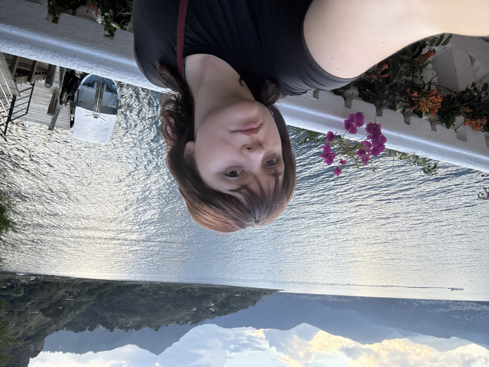 A woman poses for a selfie with a scenic view. Behind her, a body of water reflects sunlight. A white railing adorned with purple and orange flowers separates her from the view. Across the water, mountains rise against a partly cloudy sky. A boat is docked below near a structure with stairs. The image is rotated 180 degrees.