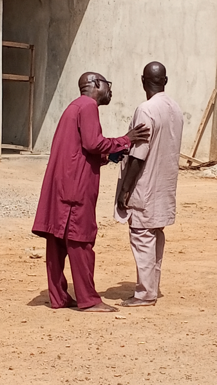 The scene, located in the city of Ogbono, Nigeria, depicts two adult males engaged in a close outdoor interaction. They stand on a dry, light brown earthen ground with scattered small stones, under bright sunlight. The background features a light-colored building wall displaying distinct shadows, with a partial wooden frame visible on the left and a vertical wooden plank on the right. The male on the left, facing right, is bald, wears dark-rimmed glasses, and is dressed in a long-sleeved, maroon tunic and matching trousers. He is barefoot. His left hand holds a dark-colored smartphone at waist level, while his right hand rests on the left shoulder of the second male. The male on the right, positioned with his back partially to the viewer, is also bald and wears a short-sleeved, light-colored (pale pink or beige) tunic with matching trousers. He is barefoot. Both individuals cast clear shadows on the ground, indicating direct overhead sunlight.