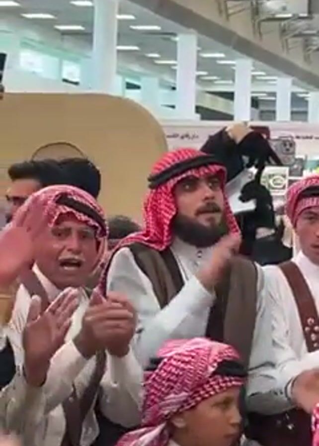 A group of Middle Eastern men and a child, dressed in traditional clothing, are singing and clapping their hands