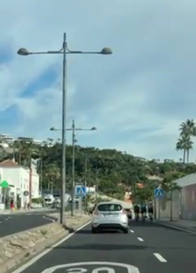 car driving down a road in a sunny, tropical-looking area. There's a white car in front of the camera car, followed by a group of cyclists. The road has a painted speed limit of 30. On either side of the road, there are sidewalks, buildings, palm trees, and light posts. A lush green hill is visible in the background, dotted with houses and more palm trees. The sky is partly cloudy.