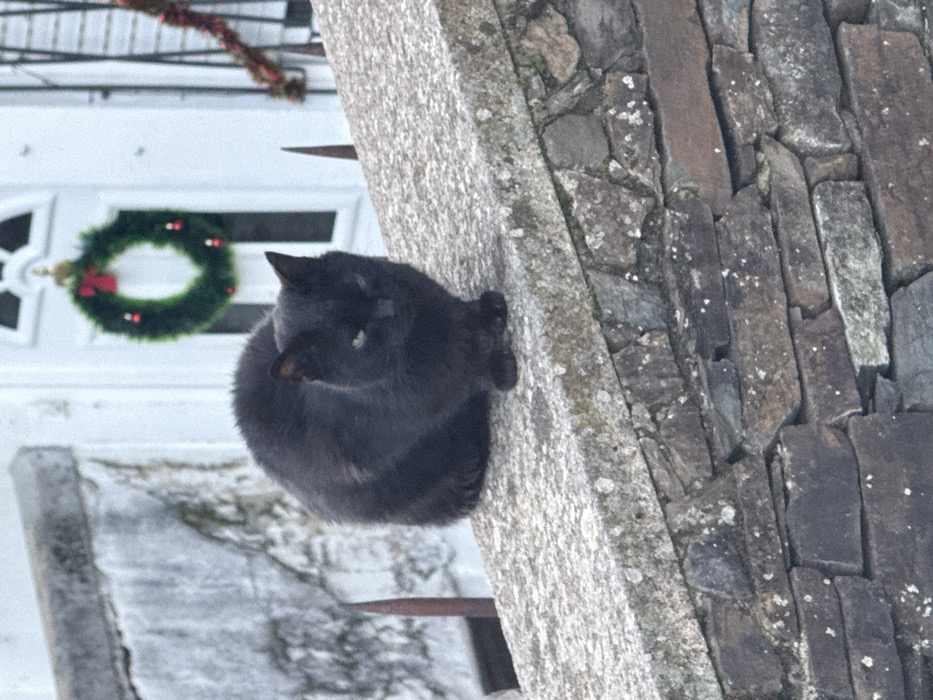 A plump, gray cat sits on a weathered stone wall with a wrought iron rail. The wall borders a building adorned with a white door and a festive wreath. Adjacent to the wall is a structure of dark, closely-packed stones. The photograph's orientation gives the scene a slightly tilted perspective.