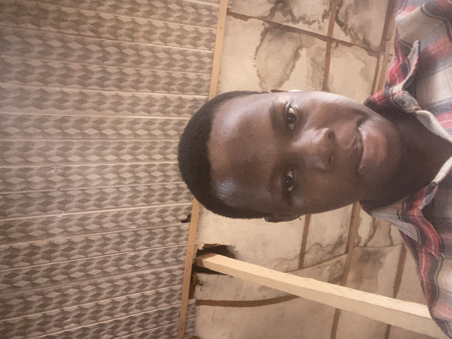 A person with dark skin and short, dark hair smiles at the camera. They wear a red and white checkered shirt. Behind them, the background is divided into two distinct parts. The left side features a wall with a geometric, repeating pattern of stacked cubes in shades of gray and brown. The right side shows a mottled wall with stains and discoloration. A piece of wood is visible in the lower part of the background, likely related to construction or repair.