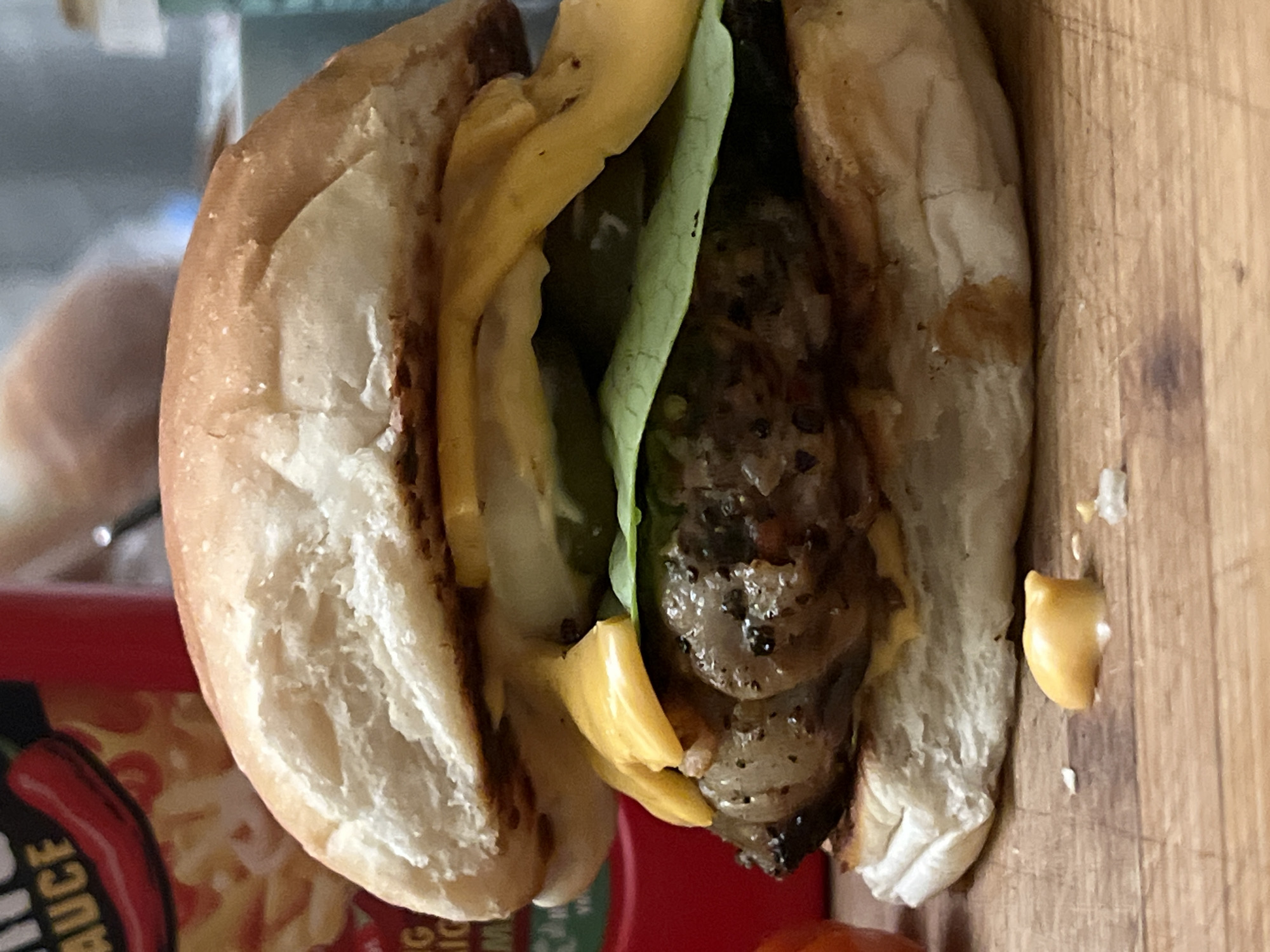 A close-up photograph captures a prepared cheeseburger resting on a light-colored wooden surface, situated in the city of Geldrop, Netherlands. The burger features a toasted white bun encasing a dark, seasoned meat patty, topped with multiple slices of melted yellow cheese, green lettuce, and discernible slices of pickles and onions. A small glob of yellow condiment is present on the wooden surface adjacent to the burger's base. The background, blurred, reveals a red bottle marked "SAUCE" with a red chili pepper graphic on the left, and an indistinct light blue object on the right, indicating an indoor setting. No individuals or active interactions are depicted.