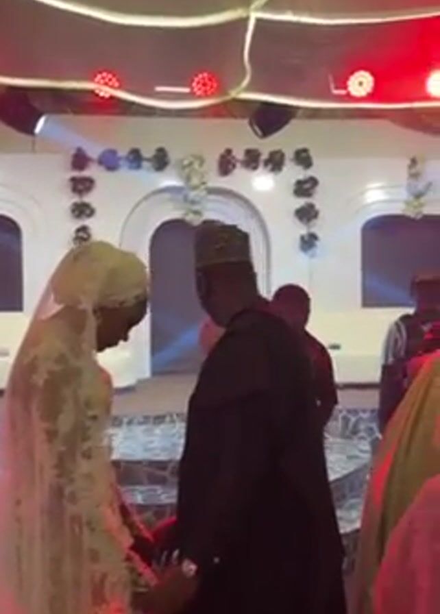 A wedding reception is underway. The bride, wearing a lace gown and veil, walks hand-in-hand with a man in a dark robe and hat. Around them are guests dressed in traditional attire, many wearing head coverings. The room is decorated with white arches and seating. Red and white spotlights illuminate the scene. Everyone appears to be having a good time, dancing.