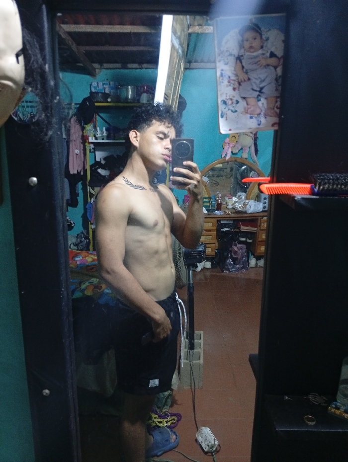 A shirtless man with dark curly hair and a tattoo on his left collarbone takes a mirror selfie. He is wearing black shorts with a white drawstring. The room behind him is cluttered with shelves, personal items, and a baby poster. A fan stands near a dresser topped with a mirror. The mirror's surface reflects the man's image. Additional items like a hairbrush and a mannequin are visible within the mirror's frame. The floor is tiled.