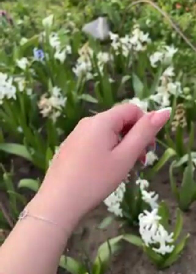 A hand is shown in front of a flower bed with white hyacinth flowers