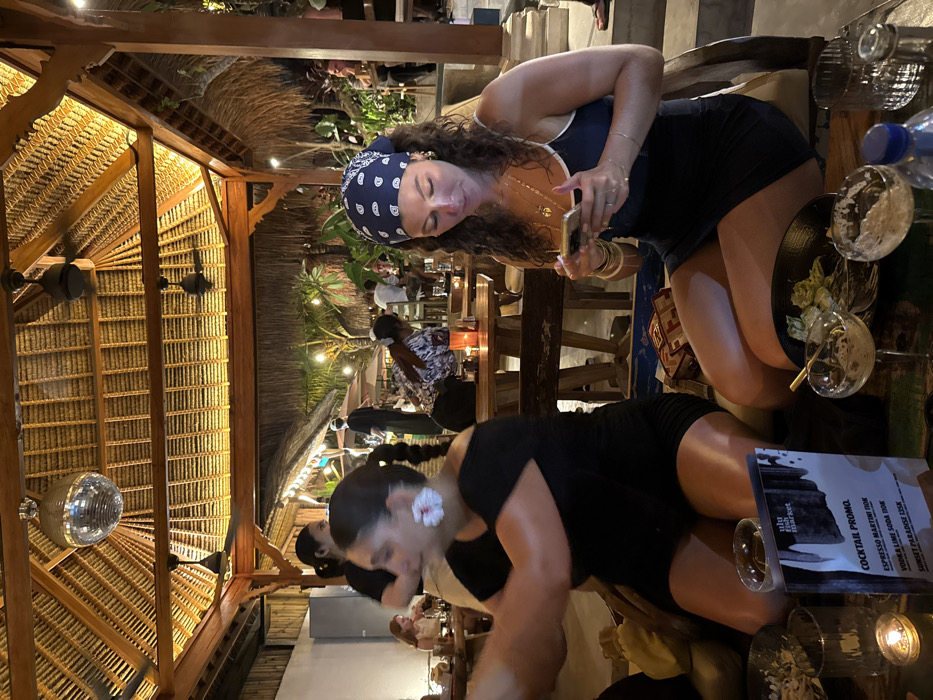 This image depicts a nighttime scene within an open-air restaurant or bar, identified as "Ulu Market" based on a visible menu, located in Uluwatu, Indonesia. The venue features a thatched roof supported by wooden beams, from which a disco ball and ceiling fans are suspended. Warm, dim lighting illuminates the space, originating from overhead fixtures, string lights in the background, and small table lamps. In the foreground, two adult females are seated at a low, dark wooden table. The woman on the left has dark hair styled back, wears a black off-the-shoulder dress, and large white flower-shaped earrings. Her right arm is raised and slightly blurred, suggesting motion. The woman on the right has long, curly dark hair, wears a navy blue bandana with white patterns, a navy blue tank top with white trim, a black mini-skirt, gold-colored bracelets, rings, and a necklace with a pendant. She is actively engaging with a smartphone held in both hands. On the table in front of them are several glasses, some containing partially consumed beverages or food remnants, a blue plastic water bottle, and a menu card displaying "Ulu Market," "COCKTAIL PROMO," and prices for items such as "Espresso Martini" and "Sunset Paradise." In the midground and background, additional patrons are seated at wooden tables, and staff members wearing black attire are visible. Lush foliage and further string lights are present in the deeper background, indicating an outdoor or semi-outdoor setting.