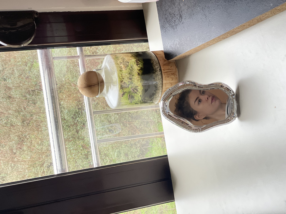 An interior scene in Boreti, Montenegro, captures a white tabletop by a window overlooking dense outdoor foliage. On the table, a small, irregularly shaped mirror with a mosaic frame reflects a female subject: a woman with light skin, brown hair styled upwards, and a neutral expression, looking slightly to the viewer's left. She wears a striped garment. To the mirror's right, a glass terrarium with a wooden stopper and base contains green moss, small plants, and stratified soil/gravel. Behind these objects, a window with a dark frame reveals a metallic balcony railing. Beyond the railing, an expanse of green and brown trees or shrubs is visible under diffuse daylight. A dark, textured surface is partially visible on the right side of the frame, adjacent to the white tabletop.