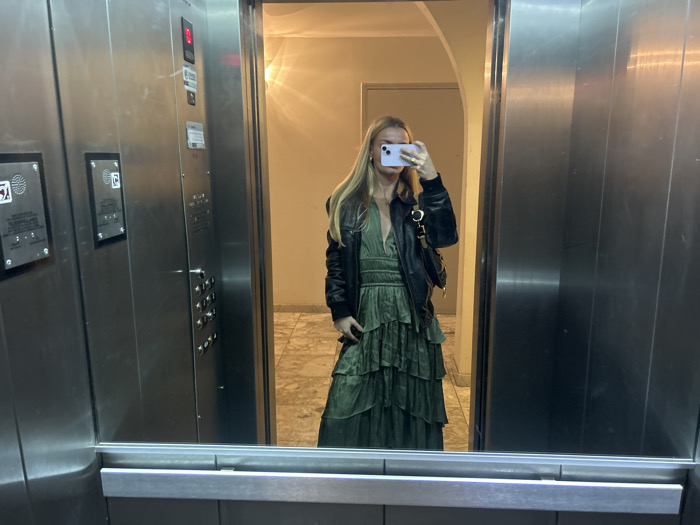 An individual is shown taking a mirror selfie inside a reflective stainless steel elevator