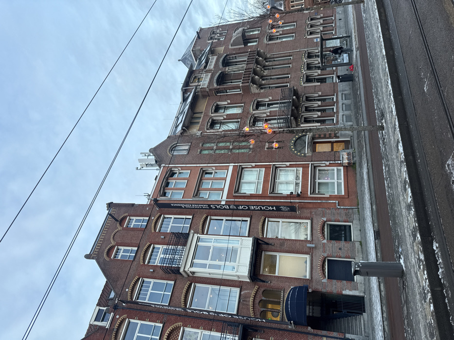 A row of tall, narrow brick buildings with many windows and various architectural details. "House of Bols" signage is visible on one of the buildings. There are power lines in the sky and what looks like a street or sidewalk on the right edge of the image. The sky is overcast.