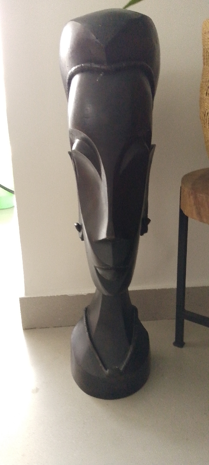 An indoor scene in Alaguntan, Nigeria, features a tall, dark, stylized carved wooden bust