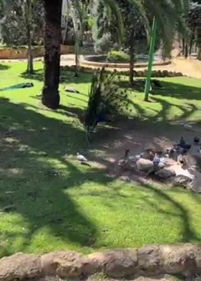 peacock displaying its tail feathers in a park setting. The peacock is on a grassy area, surrounded by pigeons and ducks pecking at the ground. Several other peacocks are visible in the background. There are palm trees and other greenery in the park. The camera is stationary.