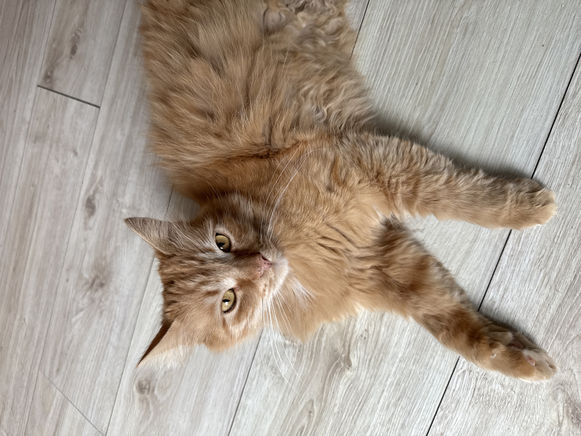 - "A fluffy, light orange tabby cat is lying on its back on a light-colored, wood-patterned floor" by FM-Foz7E2, licensed under CC BY 4.0