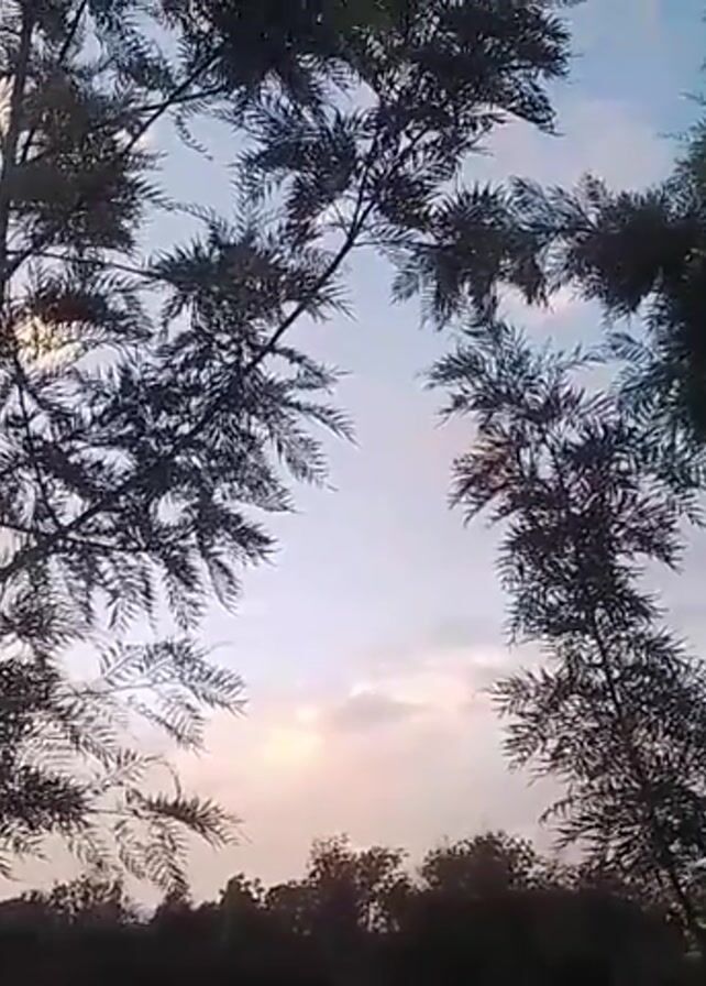 The camera points upward through the branches of trees towards a sky with a soft pastel sunset glow. The trees are silhouetted against the bright sky. The branches of the trees frame the sky, creating a natural border around the scene. Below the trees, a low, dark treeline or forested area is visible. There is no movement in the video.