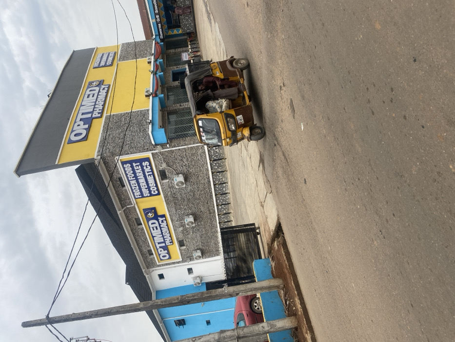 The scene depicts a daylight street view in the city of AlakIa, Nigeria, under an overcast sky. Dominating the right side is a two-story commercial building with a distinct yellow and gray facade. The upper section is yellow, displaying large blue lettering for "OPTIMED PHARMACY." The lower section features a gray textured or stone-like finish. Signs on the building also advertise "FROZEN FOODS," "SUPERMARKET," and "COSMETICS." Several exterior air conditioning units are mounted on the lower facade. Adjacent to the pharmacy, a smaller building with blue trim shows signage for "Shawarma Grill Smoothie," with indistinct figures of people visible in its vicinity. In the midground, a brown and yellow three-wheeled auto-rickshaw (Keke Napep) is in motion, positioned on a cracked asphalt road, turning right. Two individuals are inside the auto-rickshaw; the driver, wearing a maroon-colored garment, is visible in the front, and a passenger, partly obscured, is seated behind. To the left, a tall wooden utility pole with multiple wires extends upwards. A red sedan is partially visible, parked behind a low blue barrier or wall on the left side of the frame. The road surface exhibits cracks and scattered debris.