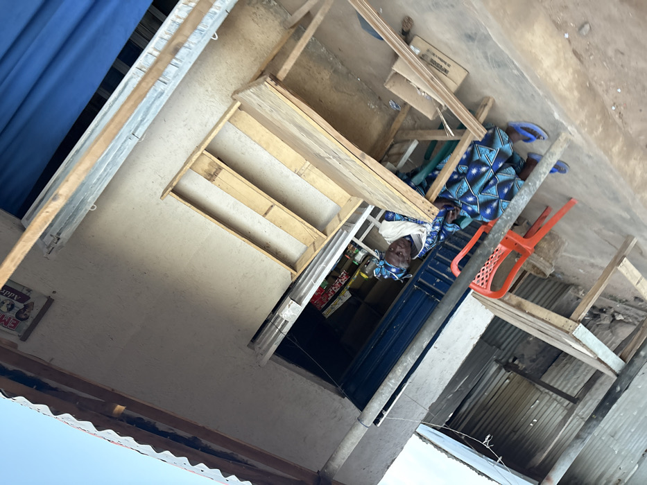 The image displays an outdoor commercial scene in Rafin Par, Nigeria, featuring a small, single-story establishment under bright daylight