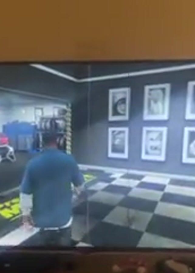 person playing the video game Grand Theft Auto V on a television. The character in the game is standing in a garage with a black and white checkered floor. A white sports car is parked in the garage. There are six framed black and white photographs of car parts on the wall. The television is sitting on a wooden entertainment center. A plastic water bottle is positioned in front of the television. A trophy notification appears on the screen indicating that the player has earned the "Welcome to Los Santos" trophy. There are dark speakers on either side of the television.