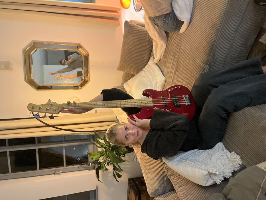 The image depicts an indoor scene in Roubaix, France, featuring a fair-skinned woman seated on a light brown ribbed sofa. She has blonde hair pulled back and is dressed in a dark long-sleeved top and dark pants. She holds a red four-string electric bass guitar vertically with her left hand gripping the neck, while her right hand is positioned near her chin. She directly faces the camera. Behind the woman, on the wall, an octagonal mirror with a gold-colored ornate frame reflects a person, likely the photographer, wearing a light gray hooded sweatshirt and glasses. This reflected individual is holding a smartphone and extending their right hand in a "peace" gesture. To the left of the woman, a multi-pane window reveals a dark exterior, indicating night. Beige curtains frame the window. A green potted plant rests on a dark wooden chest positioned beneath the window. A dark-colored floor lamp with a small blue bird ornament is situated behind the bass guitar. On the right side of the frame, an orange-toned table lamp is partially visible. The sofa also holds multiple pillows, a beige blanket, and a pair of blue jeans.