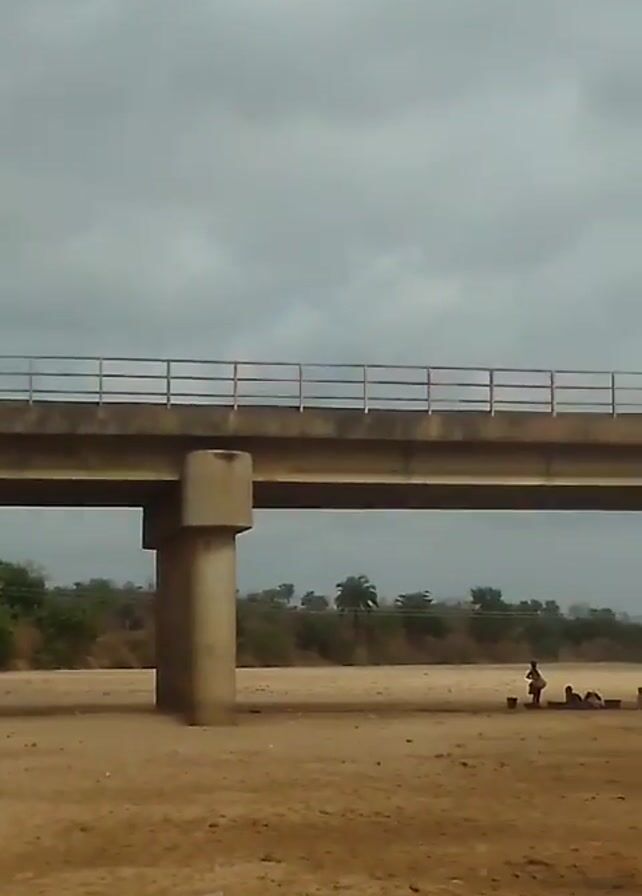 bridge over a dry riverbed. The sky is overcast. A truck drives over the bridge. Several people are sitting and standing in the dry riverbed under the bridge.