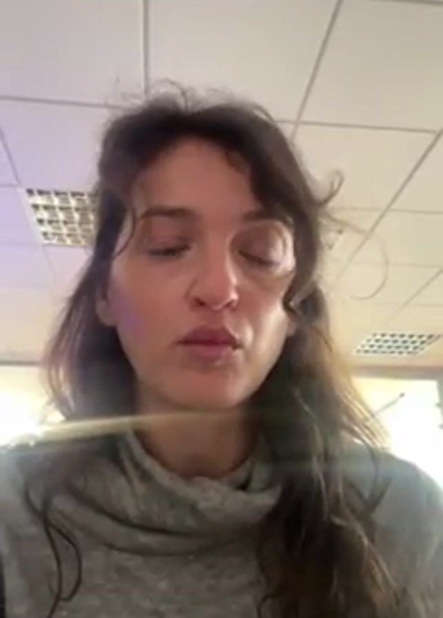 A woman with brown hair, wearing a gray sweatshirt, is indoors, holding a white cup with a blue and black logo. She drinks from the cup using a straw. The environment appears to be an office space, judging from the ceiling lights. The woman looks directly at the camera. The text on the cup includes "CAFE" and Greek lettering.