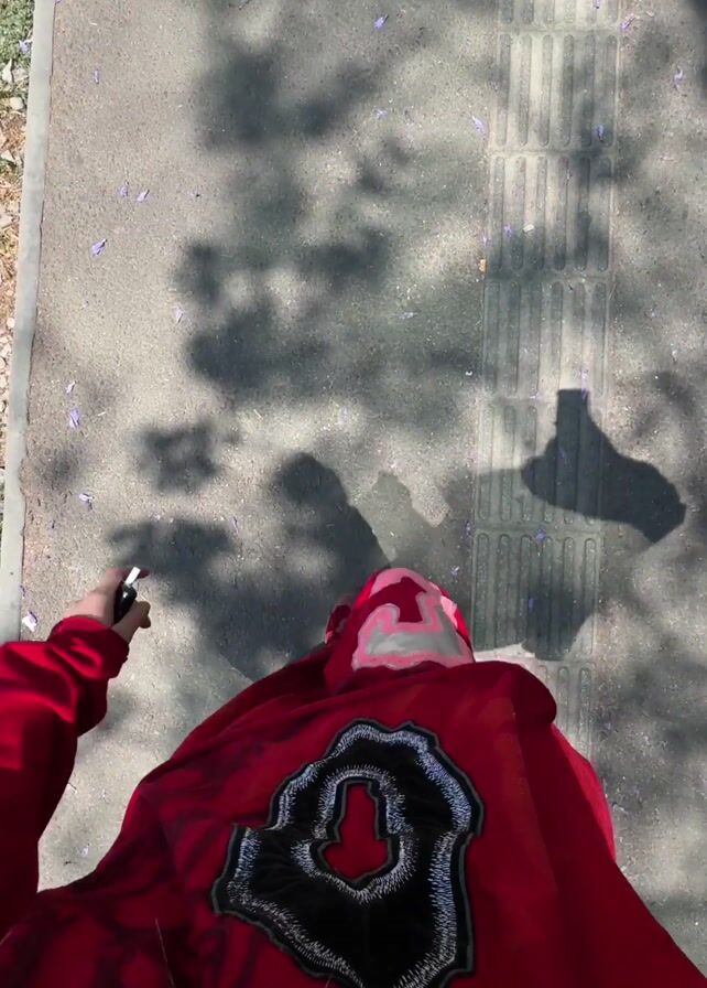 A person in red clothing and red shoes walks on a sidewalk. The person holds something small and dark in their right hand. The sidewalk has a textured section and purple flower petals scattered on it. The shadow of the person and the camera is visible on the sidewalk. Another person's leg and white shoe are briefly visible as the person in red walks past. The red clothing has a black patch with an emblem on the back.