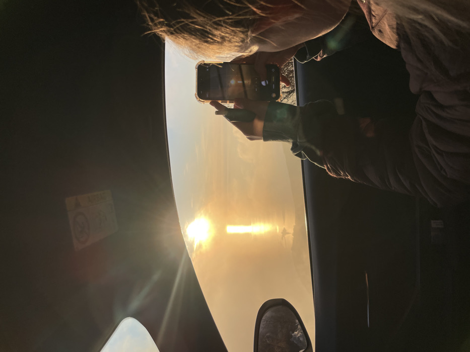 The image provides an interior view from a vehicle, specifically from the passenger side, looking out towards an exterior scene during either sunrise or sunset. A person, seen from behind with light-colored hair, dressed in a dark-colored jacket with visible teal-colored ribbed cuffs, occupies the lower right portion of the frame. This individual is holding a smartphone horizontally with both hands, pointing it towards the exterior to capture a photograph or video. The smartphone appears to have a clear protective case, and its screen visibly displays the bright outdoor light source. Inside the vehicle, a dark-colored headliner is visible at the top, featuring an illuminated airbag warning decal positioned above the passenger window. A portion of the vehicle's left side-view mirror is visible on the left, reflecting a light-toned, possibly snow-covered or rocky, surface. The exterior environment showcases a brilliant, low-lying yellow-orange sun over a vast body of water, creating a prominent vertical column of light reflection on the water's surface. Hazy, distant landmasses, possibly hills or mountains, are visible along the horizon beneath a sky that transitions from bright orange near the sun to a paler blue-grey further away. This scene is observed from Novoselje, Montenegro.