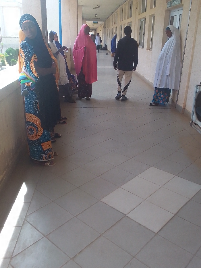 hallway in a building located at latitude 9.908 and longitude 8.96 in the city of Gwapan, Nigeria. There are seven people in the hallway. Six of them are women wearing headscarves and long dresses. One is a man wearing a black jacket and khaki pants. They are all walking in different directions. The man is walking away from the camera. One of the women is leaning against a wall. The floor is tiled with gray and white tiles. There are some windows on the right side of the hallway. There are no objects on the floor except for the people. The sun is shining brightly and casts a shadow from the wall on the left side of the hallway. The building appears to be a medical facility. The sign on the door behind the women in white reads "Gida a Gwamnatin", which translates to "Government House" in English.