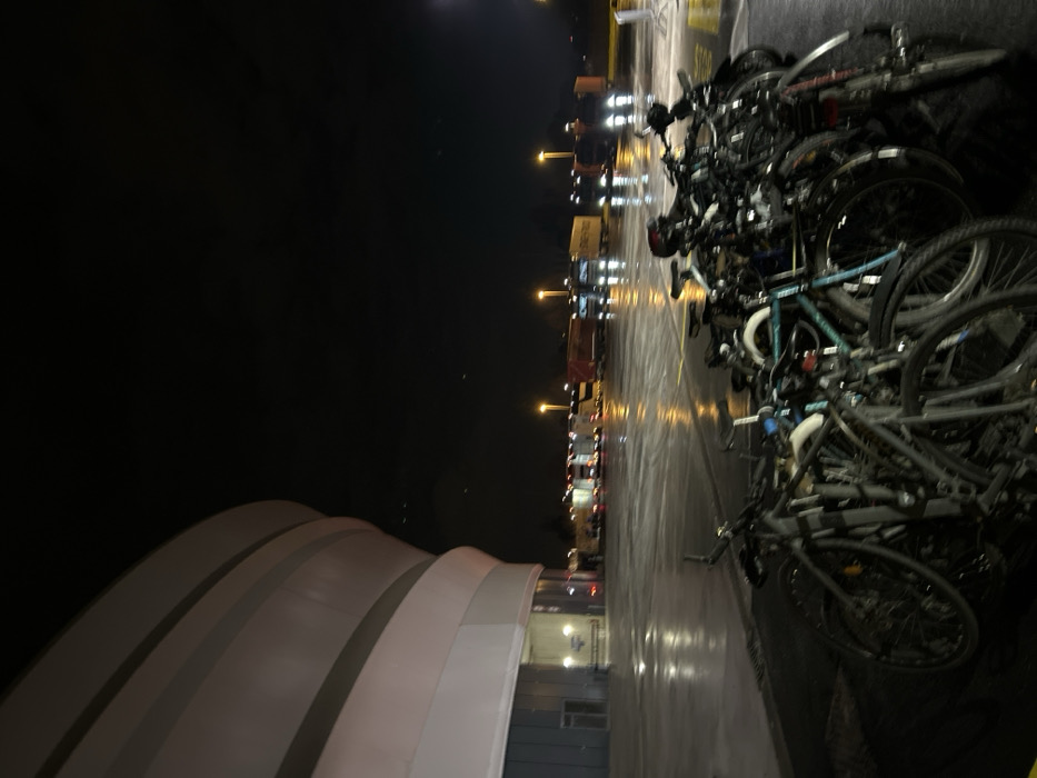 At night, a building with a white, curved roof is seen to the left. A row of parked vehicles stretches into the distance, illuminated by streetlights. A bicycle rack filled with bikes sits to the right, near the edge of what appears to be a wet, reflective surface. The scene is dimly lit.