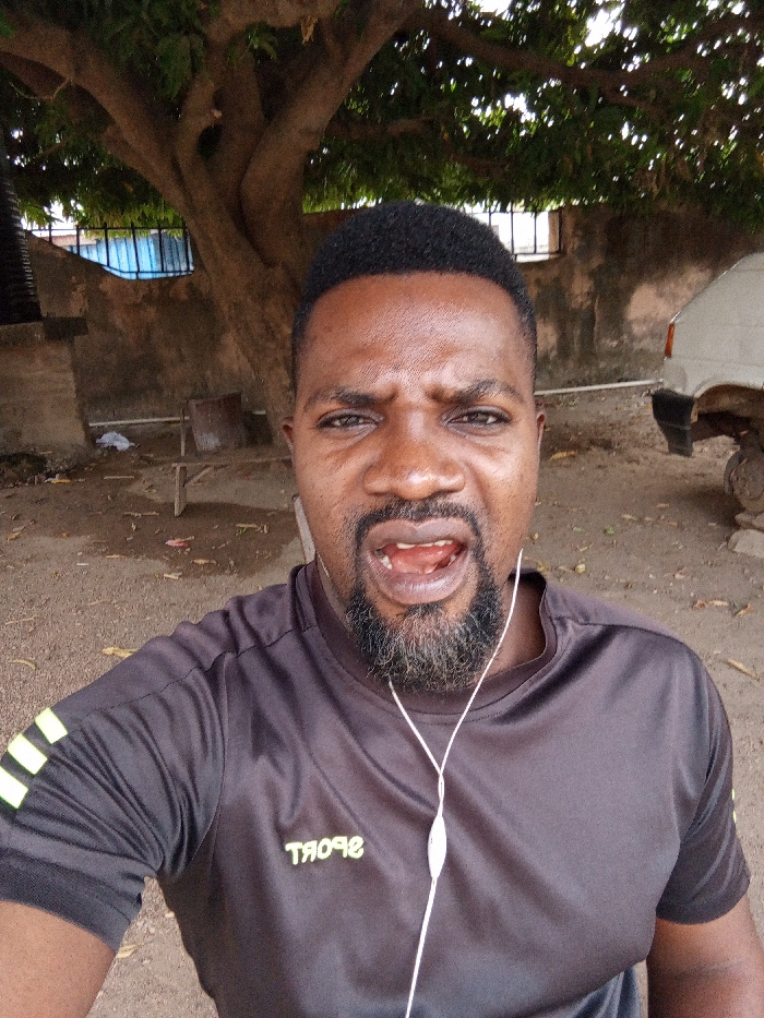 A man with dark hair and a beard is facing the camera, wearing a dark athletic shirt with yellow stripes and the word "SPORT" in reverse. He has headphones in and his mouth is open. Behind him is a tree with thick branches and foliage. In the background, there's a wall, a section of blue fencing, and the rear of a white vehicle. The ground appears to be gravel or dirt.