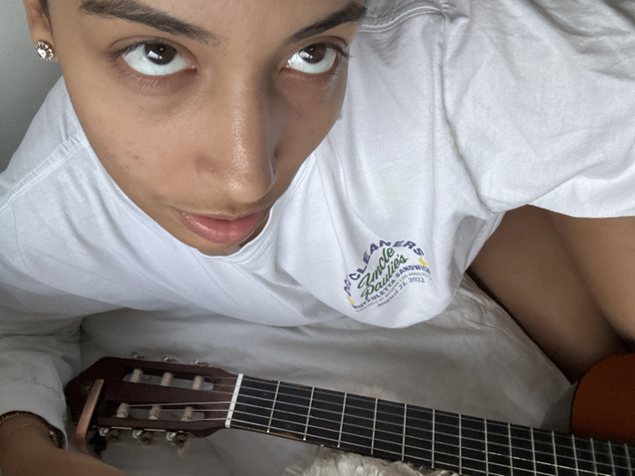 The image captures a close-up, high-angle view of an individual positioned indoors. The person has dark hair and brown eyes, looking directly upwards towards the camera. They are wearing a white, long-sleeved t-shirt. On the upper right chest area of the t-shirt, a graphic logo is visible, featuring text that includes "CLEANERS Uncle Paulie's Sandwich Muffuletta Sandwich Los Angeles August 21, 2022". A small, gold-colored, heart-shaped stud earring is present in the person's left earlobe. Below the individual's torso, the fretboard and headstock of a classical guitar are prominent. A silver-colored capo is clamped onto the guitar's headstock, over the strings. The immediate environment appears to be a light-colored, soft surface, consistent with bedding or fabric. The specific location in Maisons-Alfort, France, cannot be determined from the visual information present in the image.