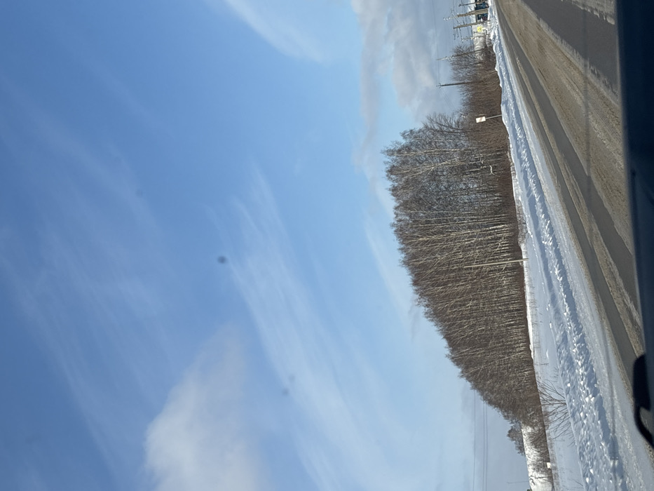 A wintery scene shows a road covered in ice and snow, bordered by bare trees against a bright blue sky with wispy clouds. Power lines run alongside the road. The view is likely taken from inside a vehicle, giving a tilted perspective of the landscape.