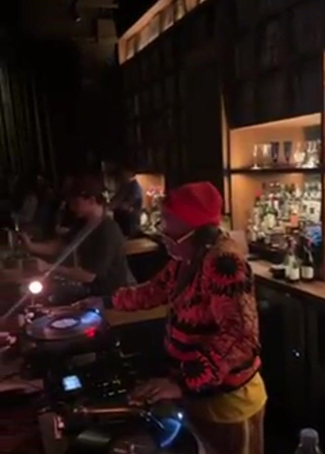 DJ, an older woman wearing a red head wrap and colorful shirt, working turntables in a dimly lit bar or club. The DJ is surrounded by bar shelves and bottles. Behind her, a bartender is seen, and in front of the DJ, a crowd of people is visible. The room is dark with ambient lighting, and the ceiling has noticeable fixtures. The video pans around the room, showing the audience and the DJ booth.