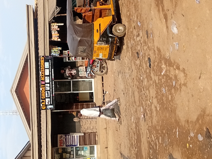 A street scene shows a small storefront labeled "AJ Gadget & Accessories." A man wearing a white shirt is standing in front of the shop. To the right is a yellow auto-rickshaw. The ground is dirt, with some trash scattered around. The building has a simple pitched roof and a brown exterior. POS signage is visible on the lower part of the store.