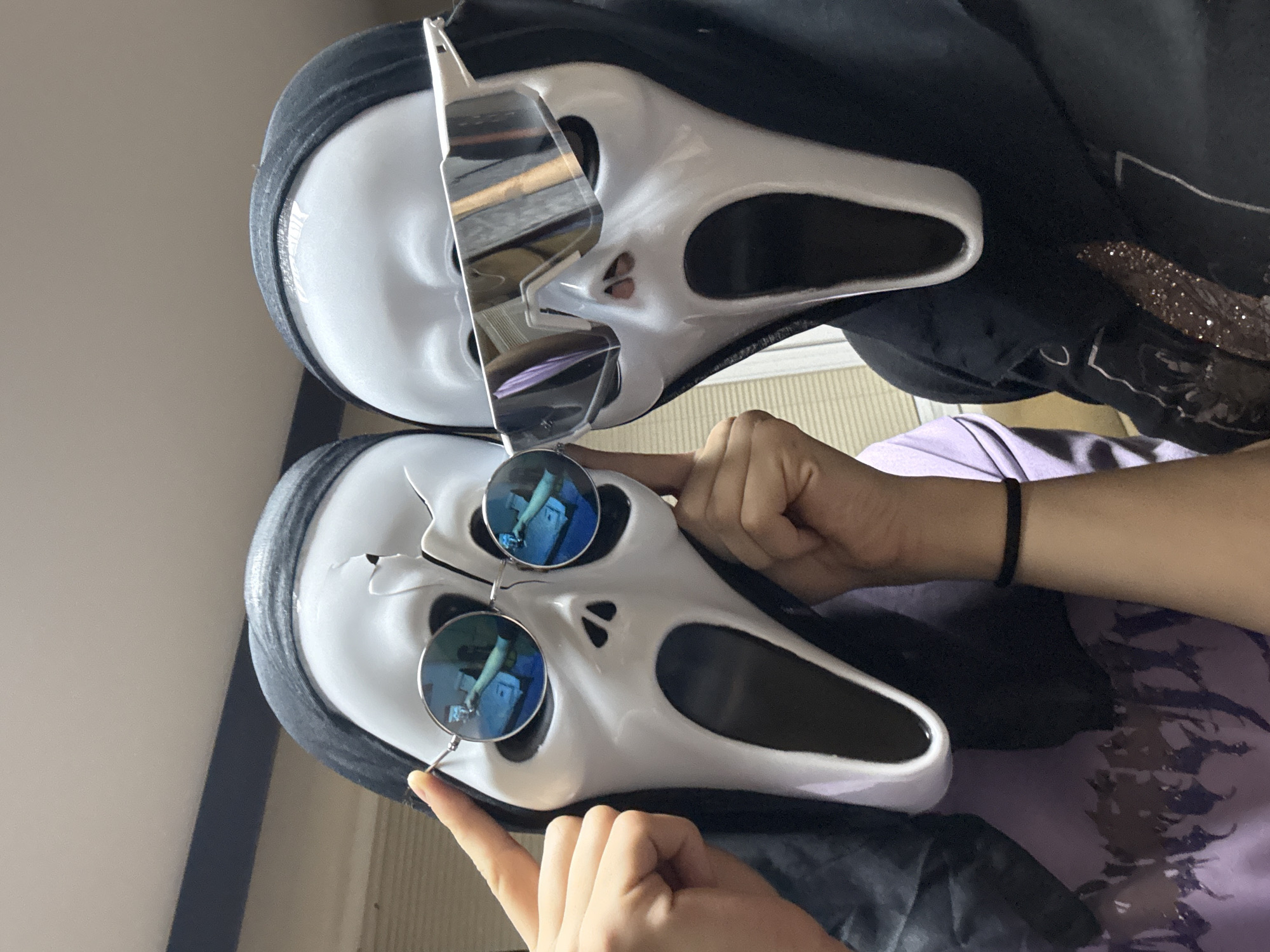 Two Scream masks are displayed. One is on top of the other. The upper mask has rectangular sunglasses, while the lower mask has round sunglasses. Two hands are holding the lower mask, with one finger pointing at the sunglasses. The scene includes a glimpse of a lilac shirt and a black wristband on the arm of the person holding the mask. The image does not provide enough information to determine the location in Gorna Oryahovitsa, Bulgaria.