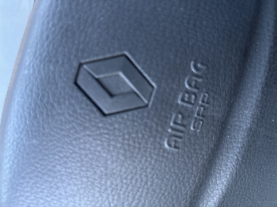 A close-up shot reveals the textured surface of a dark gray or black car interior component, possibly the dashboard or steering wheel. The Renault logo, a stylized diamond shape, is embossed on the surface. Next to it are the words "AIR BAG" and "SRP" also embossed on the surface. The image has slightly blurred focus.