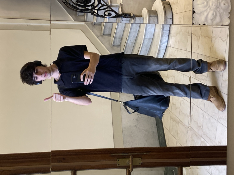 A male individual is depicted in a full-body reflection selfie captured in a multi-paneled mirror within an interior space. The subject, with dark, wavy hair and wearing black over-ear headphones, a black short-sleeved polo shirt, dark grey jeans, and light brown suede boat shoes, holds a black smartphone in their left hand, presumably for taking the image. Their right arm is raised with the thumb extended in a "thumbs up" gesture. A black shoulder bag with a long strap is slung over their right shoulder. The background features elements characteristic of an upscale entrance hall or common area in Buenos Aires, Argentina. These include a grand marble staircase with an ornate dark wrought iron railing on the right. To the left, a wooden door frame with a brass handle is visible. The floor is composed of light-colored square tiles, and the walls are a uniform light beige. A decorative, possibly stucco or plaster, relief with an organic pattern is present on the lower right mirror panel.