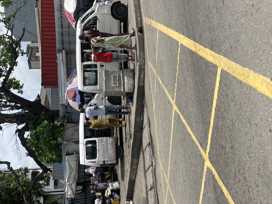 The image displays a bustling street scene in the Central Business District (CBD) of Lagos Island, Lagos, Nigeria. In the foreground, a grey asphalt road is visible, marked with prominent, faded yellow grid lines indicating a "keep clear" area. A concrete curb separates the road from a paved area in the midground. Two white passenger vans, commonly known as "Danfo" buses, are parked or idling side-by-side. The left van has its side door open, and a person is partially visible inside. The right van also has its side door open, with one individual partially visible inside. Seven people are observed interacting or waiting in the immediate vicinity of the vans. Near the left van, a male individual in a yellow and brown patterned traditional Nigerian outfit stands facing a second male individual, who wears a light-colored patterned shirt and blue jeans, with his back mostly to the viewer. Behind the left van, a person wearing a pink head covering is partially obscured by an assortment of items, including plastic bags, black buckets, and bundles, suggesting informal vending activity under a white tarp shelter. Between the two vans, a weathered grey concrete pillar, approximately waist-height, is situated on the curb, bearing the inscription "CBD" carved into its side. A green bottle lies on the ground near this pillar. Near the right van, a male individual in a red t-shirt and blue trousers stands alongside a female individual in a light green patterned dress and blue sandals, walking or standing with her back partially to the viewer. Another male individual in a dark brown shirt and trousers stands partially obscured near the right van's open door. A large, multi-colored umbrella is open above the space between the vans, and a red and white umbrella provides shade next to the right van. The background features a corrugated metal fence, behind which large trees with green foliage are visible. Further in the distance, concrete buildings and red shipping containers are discernible under a pale, cloudy sky. The overall scene depicts an active urban area, likely a transit point and informal market.