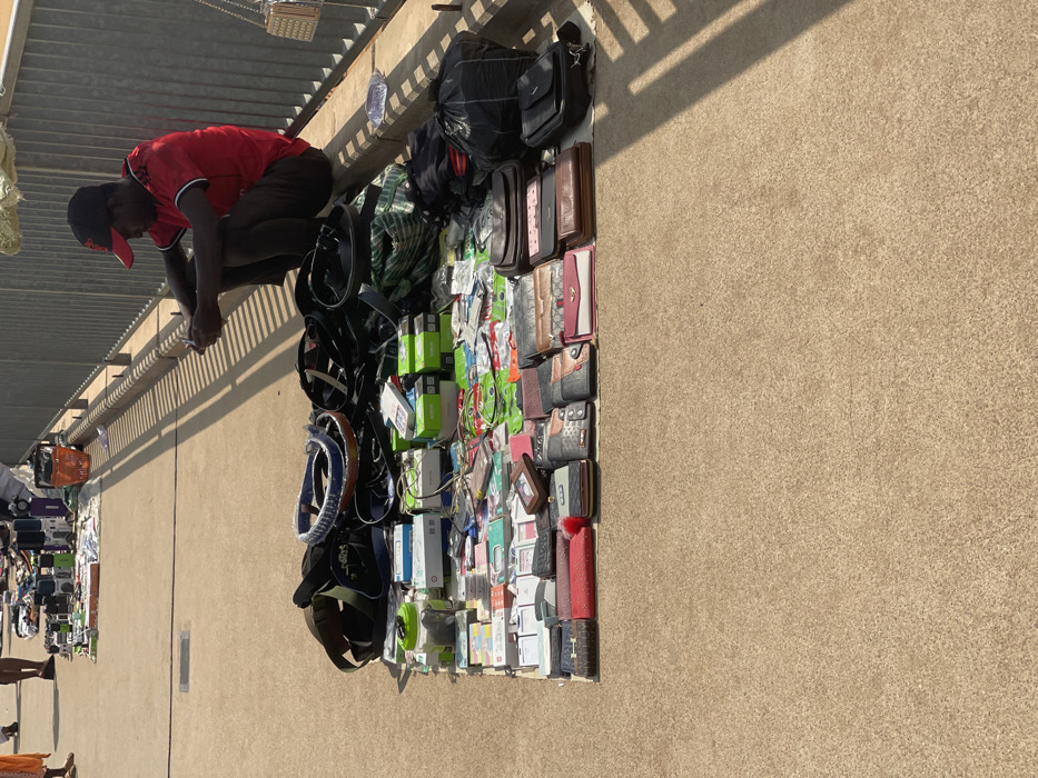 The image depicts an outdoor vendor stall in Kuchingoro, Nigeria, situated on a concrete pedestrian walkway or bridge under direct sunlight