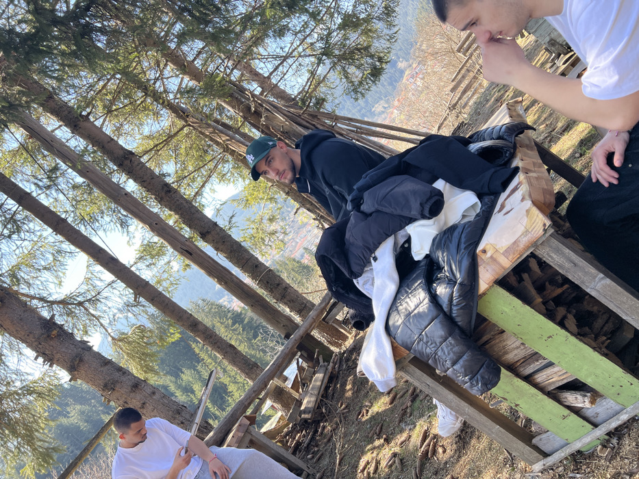 The image depicts an outdoor scene in a forested area of Chepelare, Bulgaria, overlooking a town. Three males are present under a clear blue sky on a sunny day. In the foreground, a rustic wooden structure, resembling a table or bench, is visible. It features a top surface constructed from light-colored planks and a base with green-painted vertical supports. Stacked firewood is contained within the base. Piled on the wooden surface are several items of clothing, including at least two black puffer jackets and two white long-sleeved shirts or hoodies. The ground in the immediate foreground is covered with dirt, dry leaves, and numerous pine cones. To the center-right, a male is seated, wearing a black hooded sweatshirt and a dark green baseball cap with a white "LA" logo. He has facial hair and is looking upwards and slightly to his left. To the far left, a second male is partially visible, standing or leaning. He wears a white short-sleeved t-shirt and light grey sweatpants, and a pink bracelet is on his left wrist. He is looking downwards at an object held in his hands. In the lower right corner, a third male is partially visible, showing his right side profile, right shoulder, and right arm. He wears a white short-sleeved t-shirt, and his right hand is positioned near his mouth or nose. The midground and background feature multiple tall, coniferous tree trunks angled diagonally across the frame, with green foliage against the bright sky. In the distant valley, a cluster of buildings with reddish roofs, indicative of a town, is visible, backed by forested mountains.