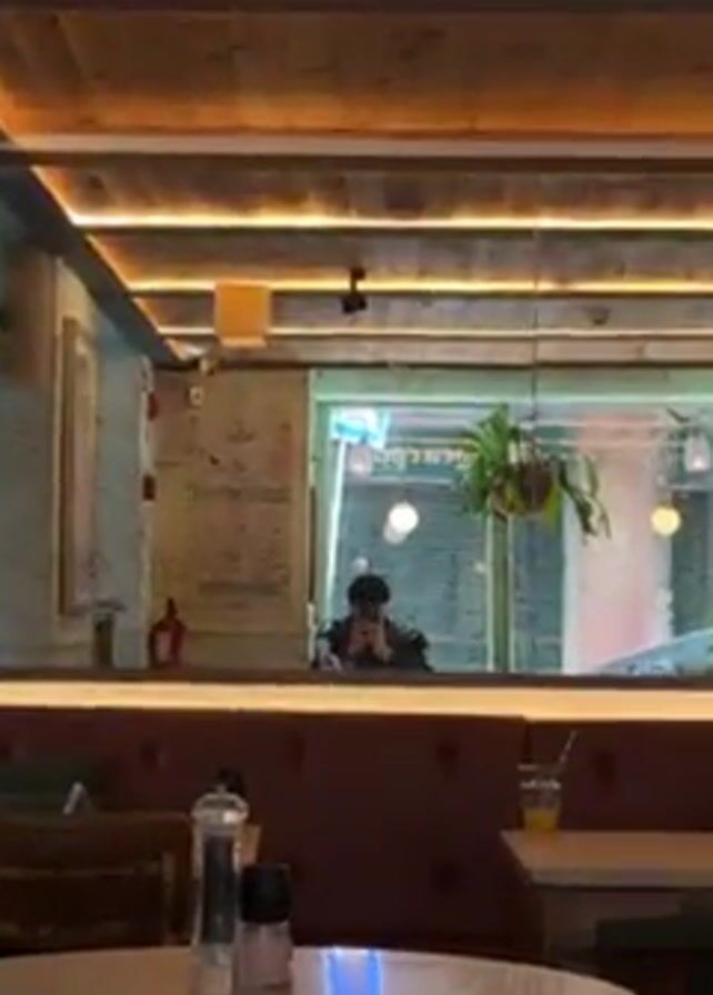 A shot in an indoor restaurant shows a mirror framed by light wood, with a person in a black beanie, leather jacket, and wrist adornments taking a photo of themselves in the mirror. The restaurant has tables with salt and pepper shakers, chairs, and a cushioned bench. Through the window reflected in the mirror, one can see the outside street and a second person walking by, wearing a baseball cap. The walls of the restaurant are partially white brick.