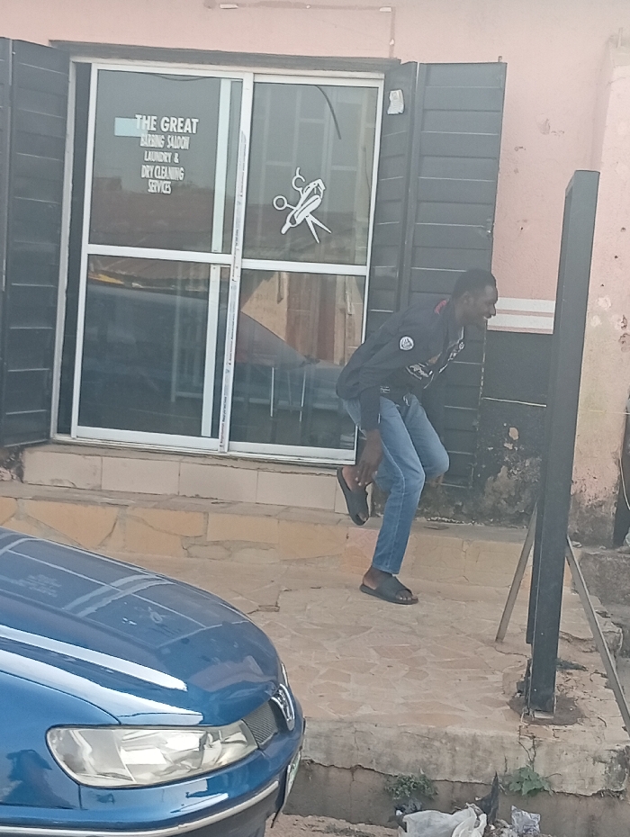 The image depicts a street scene in Jos, Nigeria, in front of "THE GREAT BARBING SALOON LAUNDRY & DRY CLEANING SERVICES." The precise address within Jos is not discernible from the image. The building features an aluminum-framed glass double-door entrance, flanked by dark grey slatted panels. Above the entrance, the wall is a faded light peach or pink. A decal of a stylized pair of scissors and a comb is affixed to the right glass door. In the mid-ground, a dark-skinned male individual, wearing blue jeans, a dark jacket, and black sandals, is standing on a light-colored tiled patio or sidewalk in front of the saloon. He is captured mid-action, with his right knee bent and left leg partially extended, leaning slightly forward and to his right. His head is turned to the right, and he appears to be smiling or laughing, looking out of frame. To the immediate right of the individual, a black metal frame or stand is visible. Below the tiled patio is a concrete curb separating it from a lower ground level where a white plastic bag and other debris are scattered. In the foreground, on the left, the front portion of a blue vehicle, likely a Peugeot due to its grille design and headlight shape, is partially visible, facing towards the right.