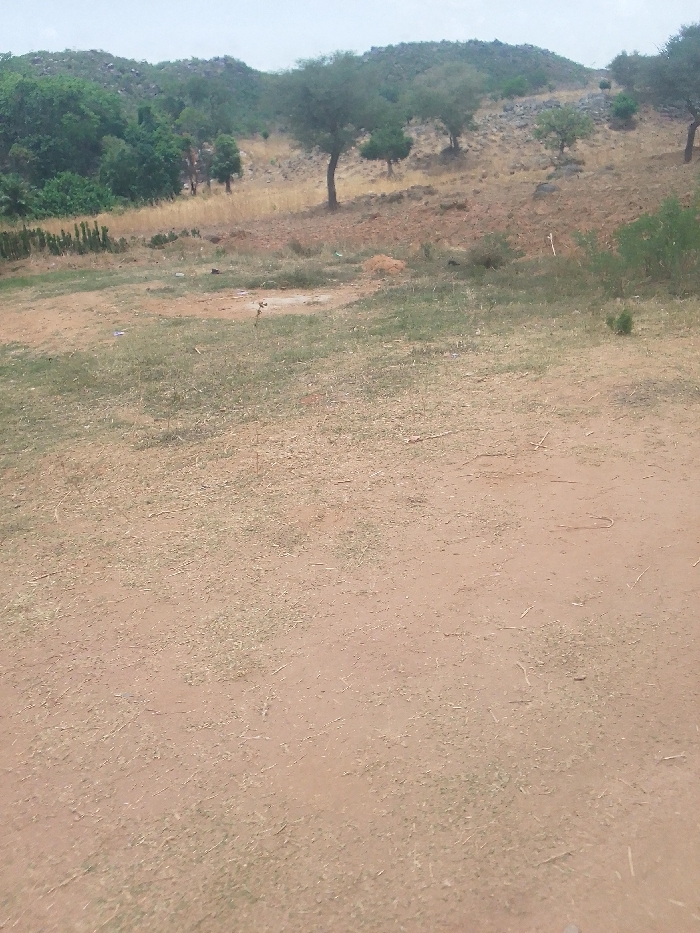 barren, dusty, and dry land in Kwal, Nigeria. The land appears to be a dirt road or a clearing in the bush. The ground is covered in sparse, dry, light brown grass. The land is mostly flat, with a slight incline in the distance where there is a hillside covered in sparse vegetation. The scene is taken from a low angle, looking towards the hill. There are no people or objects in the foreground, except for some small sticks and twigs on the ground. The sky is a light grey with an overcast look. There are small trees and bushes sparsely scattered in the distance, giving the scene an arid, dry, and empty feel. The image is likely taken in the dry season.