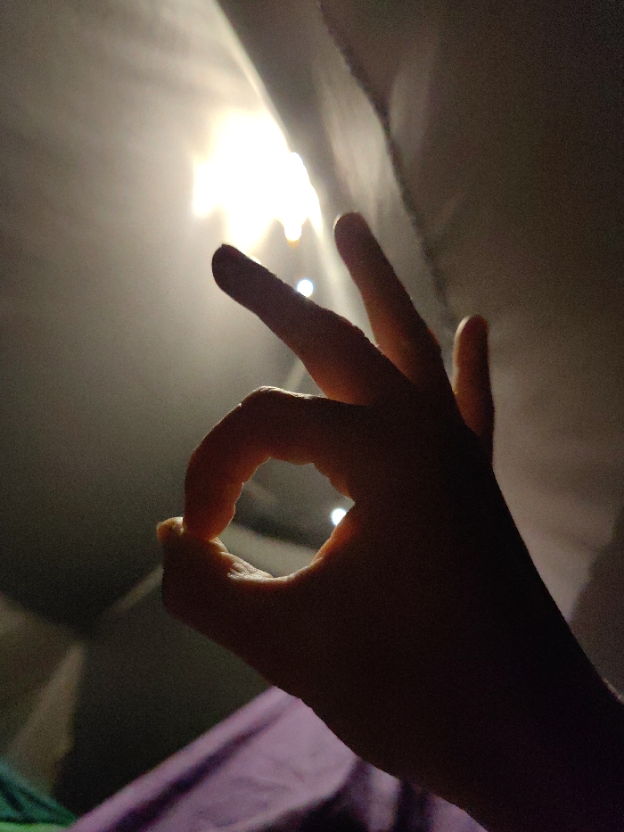 A hand makes an "OK" symbol in a dimly lit space. The thumb and forefinger form a circle, with the other fingers extended upwards. A bright light source, possibly a lamp, shines from above, creating a silhouette effect on the hand and arm. In the background, hints of purple and green fabrics suggest a bed or a covered surface, adding to the intimate, indoor setting.