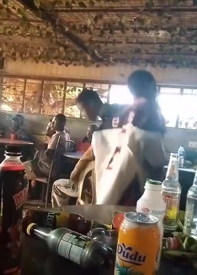 A group of people are in a covered open air space, apparently a restaurant or bar. They are mostly standing, moving and talking, and it seems some of them are dancing to music. In the foreground is a table covered in various drink bottles and cans, including beer, soft drinks, and a yogurt drink. The roofing is made of planks and decorated with leaves and vines. Behind the people, there are windows allowing light to filter in. The overall atmosphere seems lively and social.